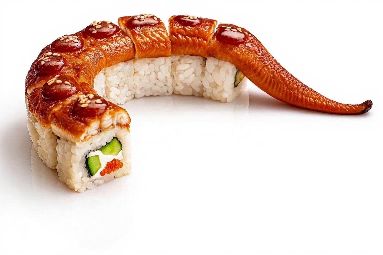 Ролл «Дракон» — это щедрая порция копчёного угря, нежнейший сливочный сыр и хрустящий огурчик. Каждый из 8 кусочков полит соусом терияки и посыпан кунжутом. Настоящее искушение, перед которым невозможно устоять! Закажите сейчас! 8 шт. Состав: угорь копченый, сливочный сыр, икра масаго, огурец, рис, нори, Вес: 260 г.
