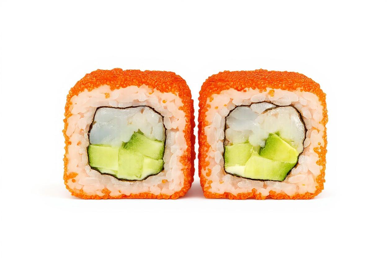 Королевский деликатес! Нежнейший морской гребешок, сливочный авокадо и хрустящий огурец в объятиях икры масаго. Каждый кусочек — чистое наслаждение. Попробуйте нашу Калифорнию с гребешком и влюбитесь навсегда! 8 шт. Состав: гребешки, авокадо, огурец, майонез, икра масаго, рис, нори. Вес: 230 г.