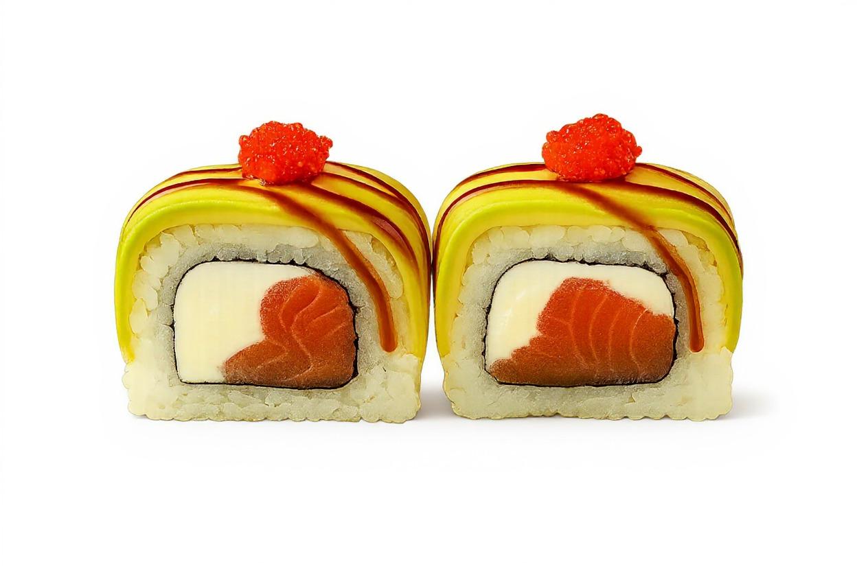 Искушение, перед которым не устоять: нежный лосось и сливочный сыр под шапочкой из спелого авокадо. Пикантный соус унаги и икра масаго добавляют взрыв вкуса. Это любовь с первого кусочка! 8 шт. Состав: лосось, сливочный сыр, авокадо, соус унаги, японский майонез, икра масаго, рис, нори. Вес: 230 г.