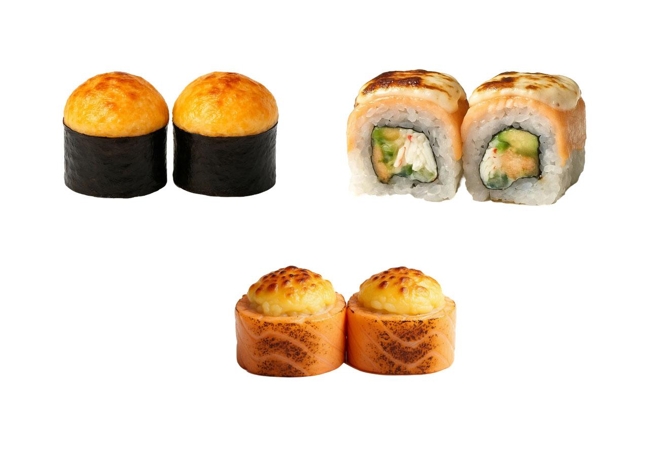 Только запеченные роллы! Теплые и нежные. 22 шт. Состав: люкс хот, роял краб запеченный, эби запеченный. Вес: 730 г.