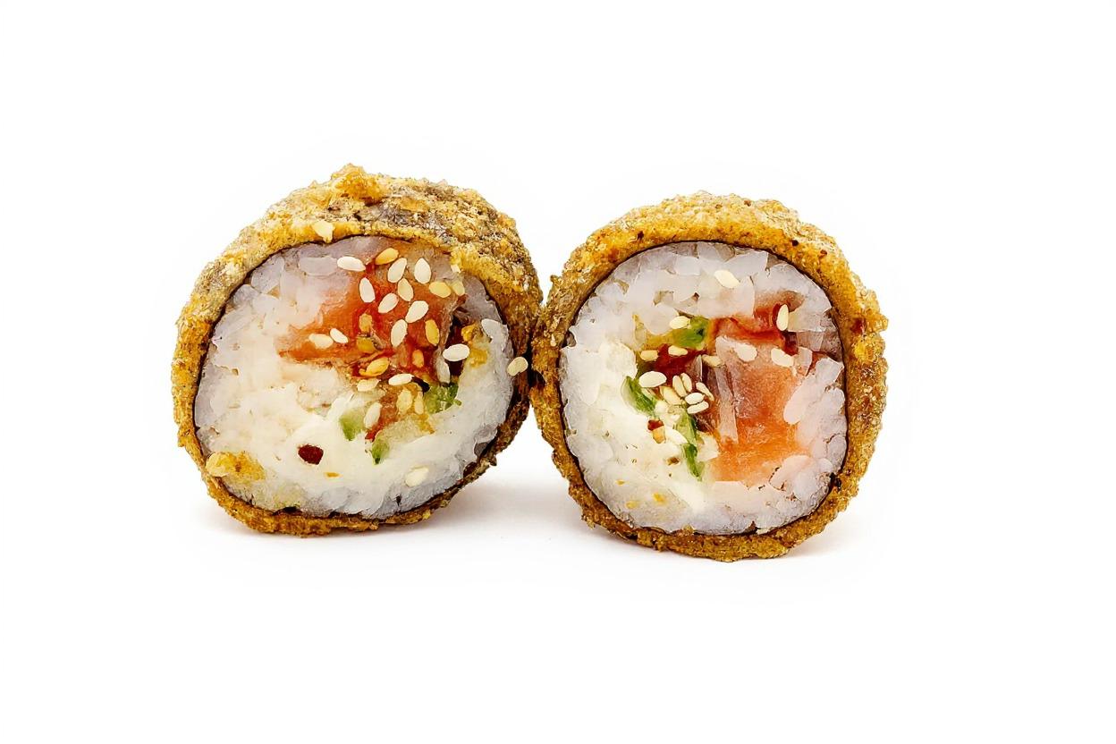 8 шт Состав: лосось, угорь, сливочный сыр, авокадо, рис, нори, кунжут, кляр, сухари панко. Вес: 270 г.