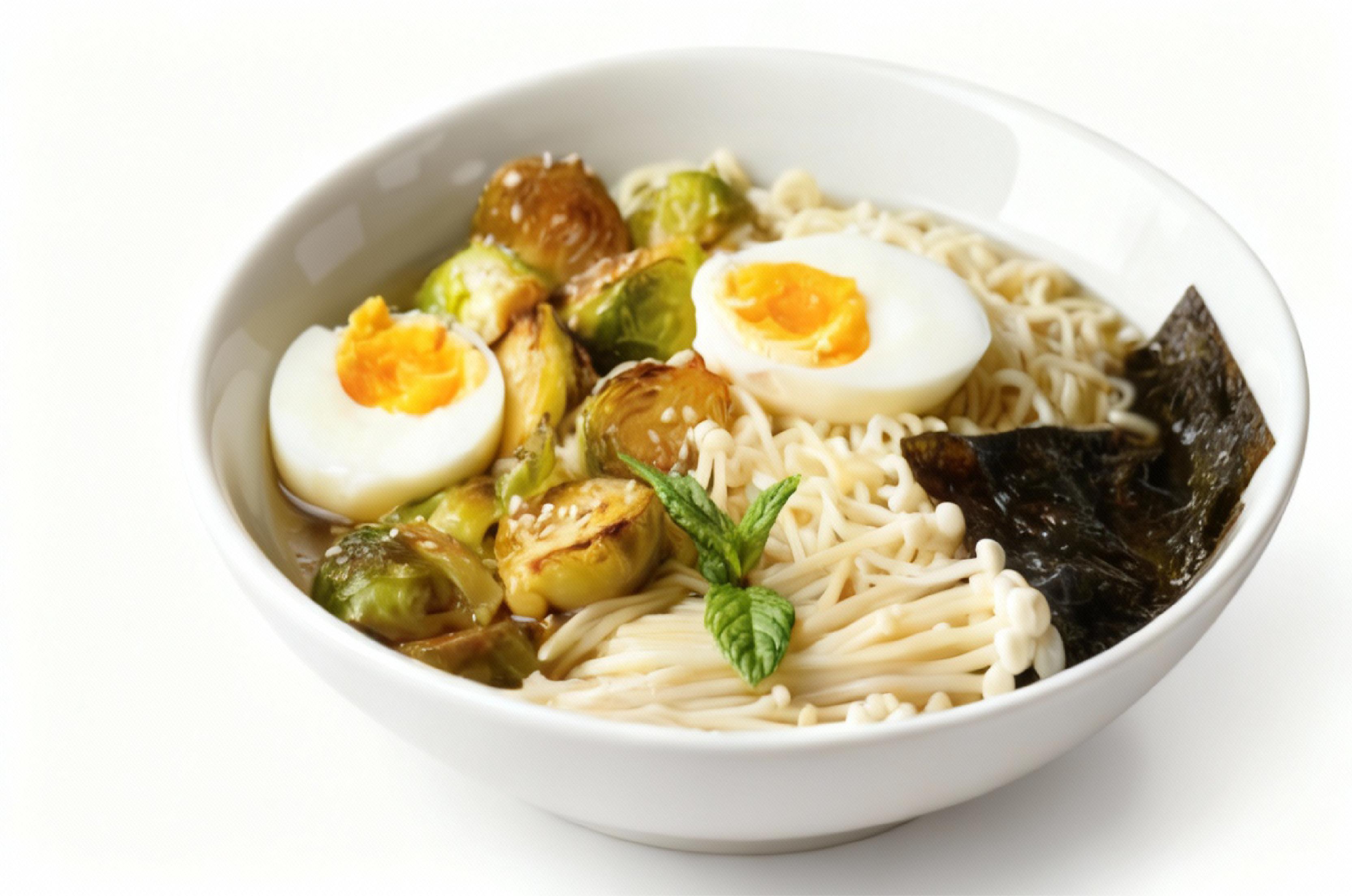 Ароматный японский суп с яичной лапшой, шиитаке, яйцом и куриным филе. Вес: 450 г.